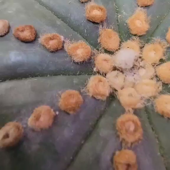 · Appearance: It has a non-branched, flat, dark green stem with a diameter of 8-16 cm and a height of 2 to 6 cm. It lacks spines but has white tufts of hairy scales (trichomes) sprinkled over the stem.
