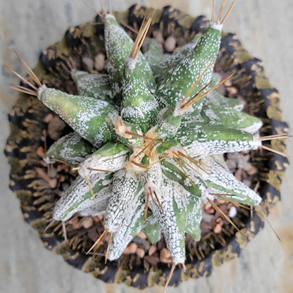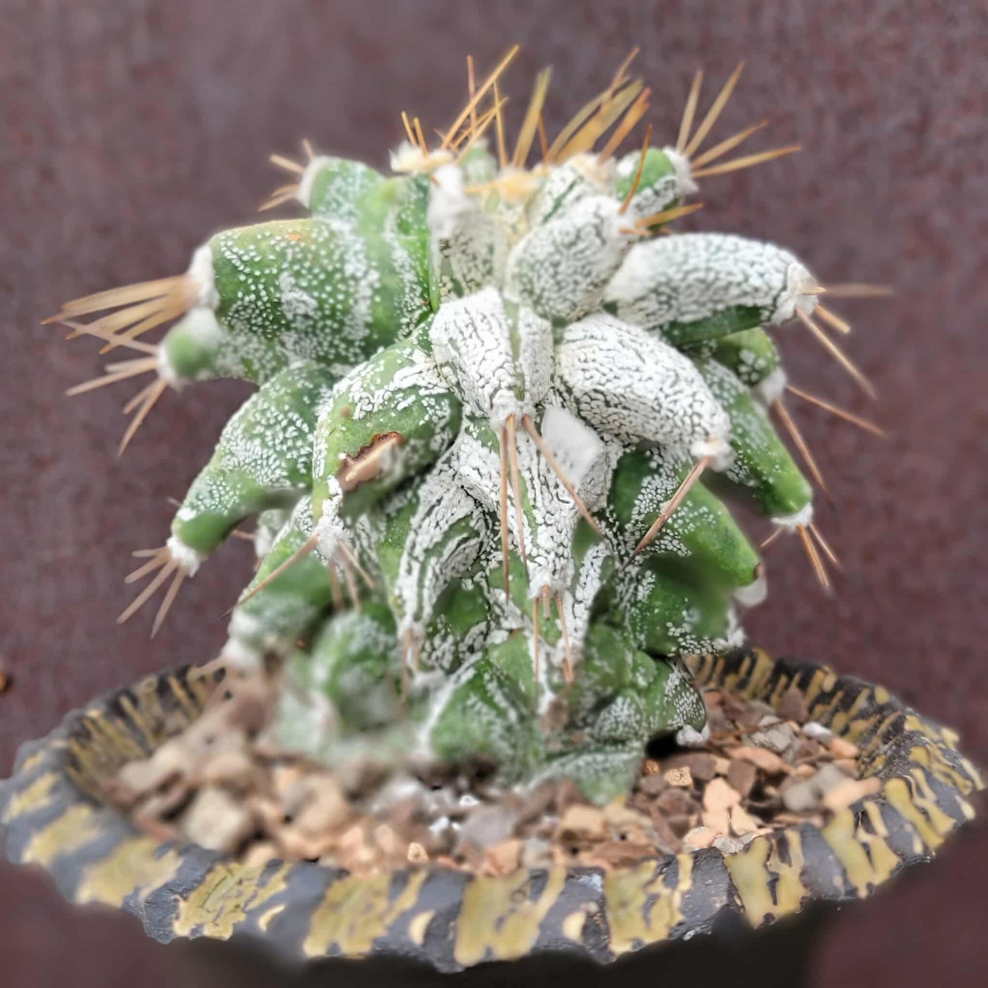 - Appearance: The plant is green to grey-green and covered in small, white flecks that can be either sparse or dense, depending on the specific clone. It also features long, stiff red-brown spines.