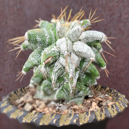 Astrophytum ornatum cv. Kikko is a rare and sought-after cultivar of the Astrophytum ornatum cactus, known for its distinct, geometric, and bumpy-looking surface. The "cv. Kikko" designation refers to this unique mutation, which causes the cactus stem to be split into prominent, conical tubercles.