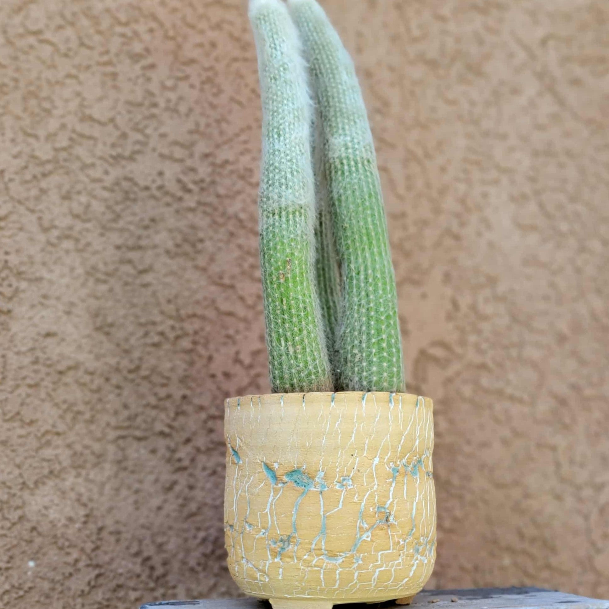- Appearance: This cactus has tall, upright, gray-green stems that can reach up to 10 feet tall in its natural habitat. The stems are covered in numerous ribs, with areoles that produce four longer yellow-brown spines surrounded by up to 40 shorter, white bristles, creating its signature "silver torch" look.