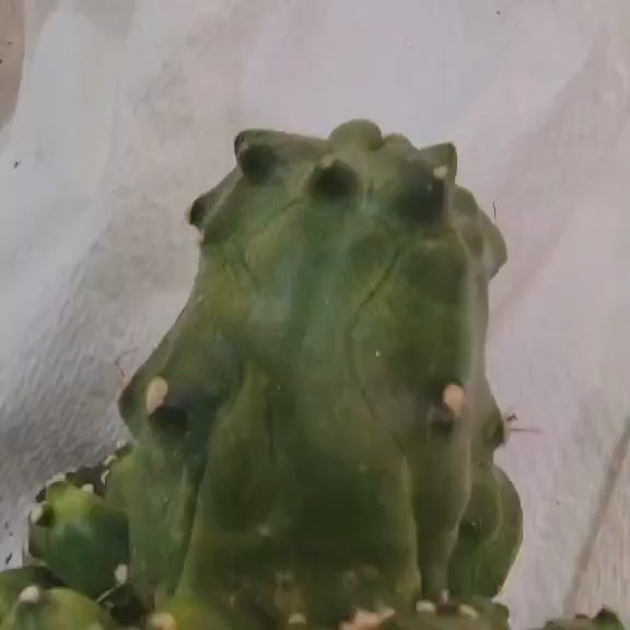 - Areoles and spines: The plant has very few areoles, which contain only short, white wool. The areoles are arranged irregularly and often fuse together to form unique horizontal lines that contrast with the stem. The few spines that are present are honey-colored to brown with darker tips.