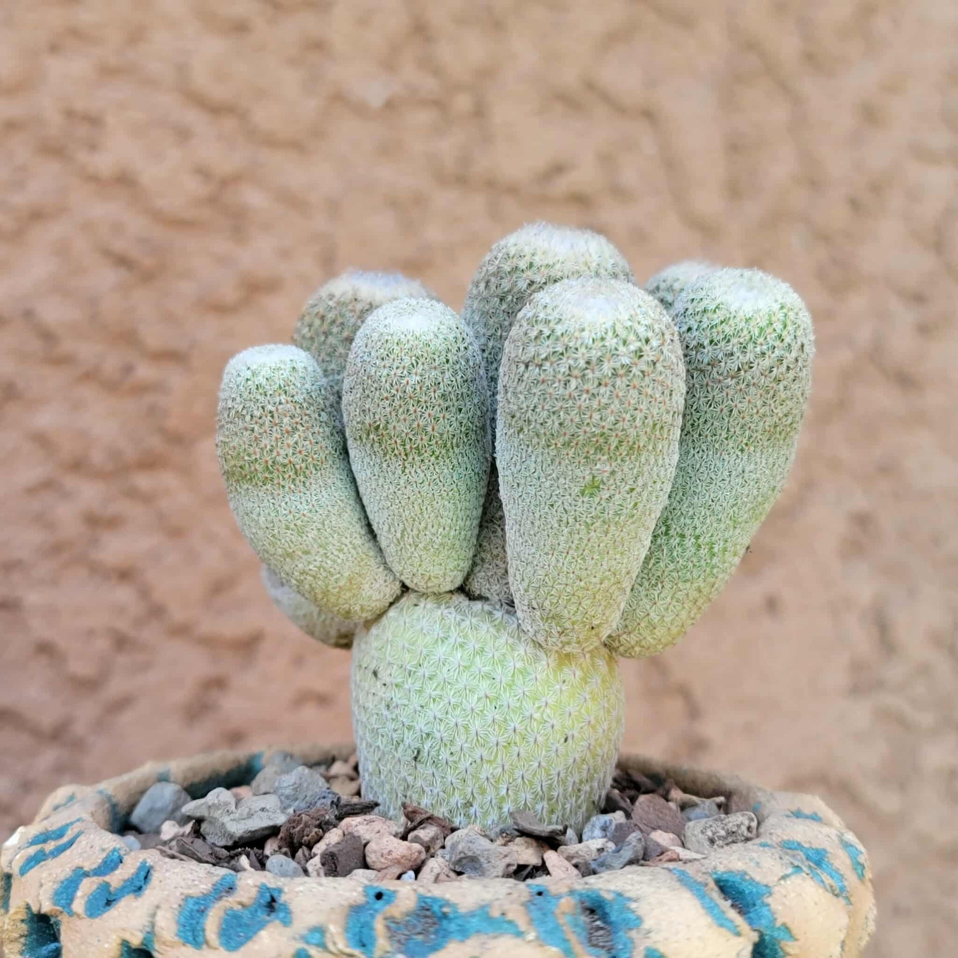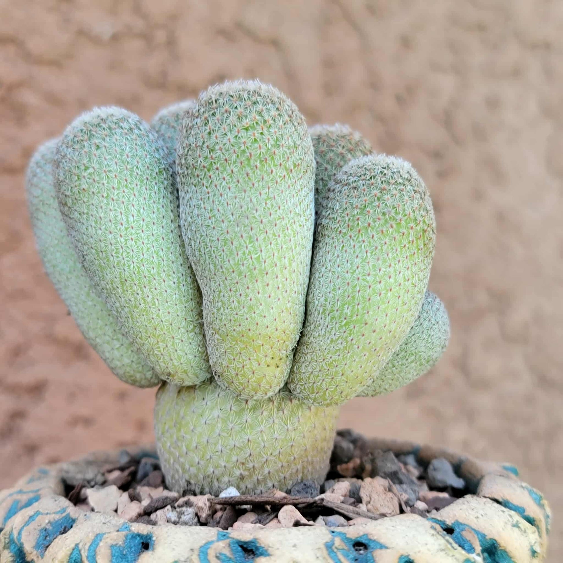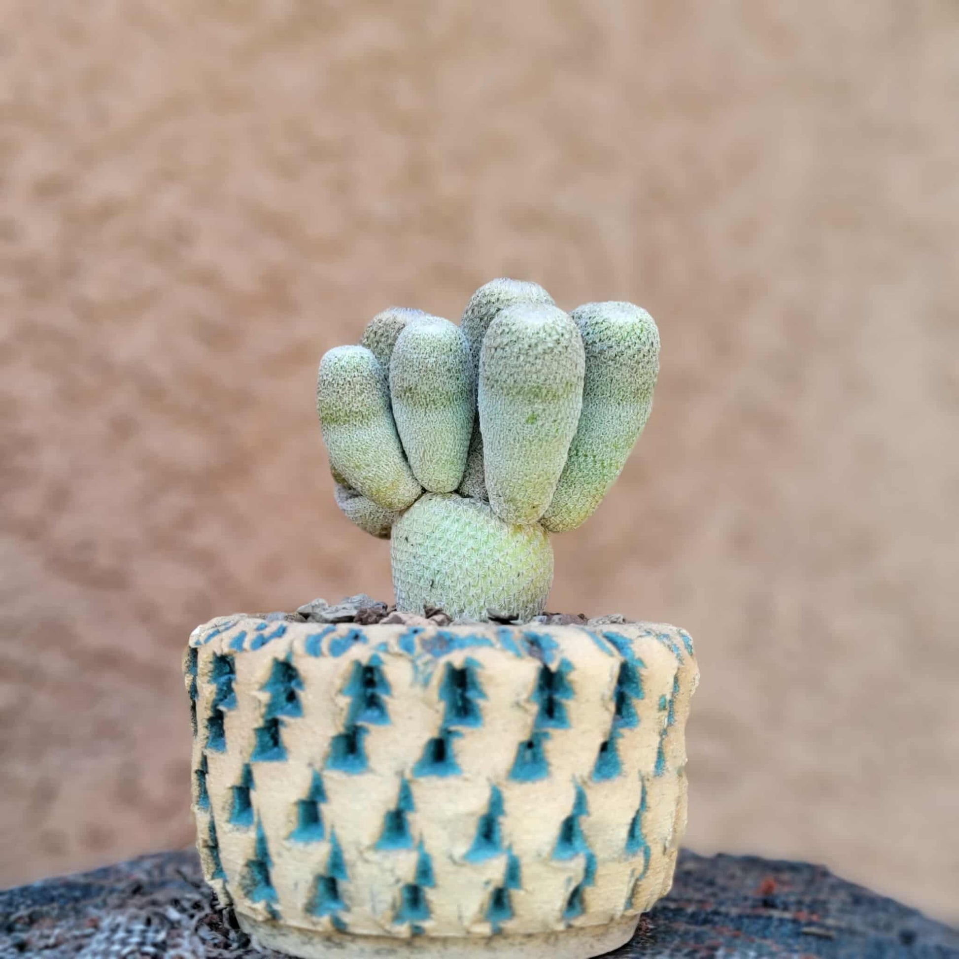 · Appearance: Small, globular cactus covered in dense, tiny, white to grayish spines that give it a fuzzy or silvery appearance. The spines often completely cover the green body.