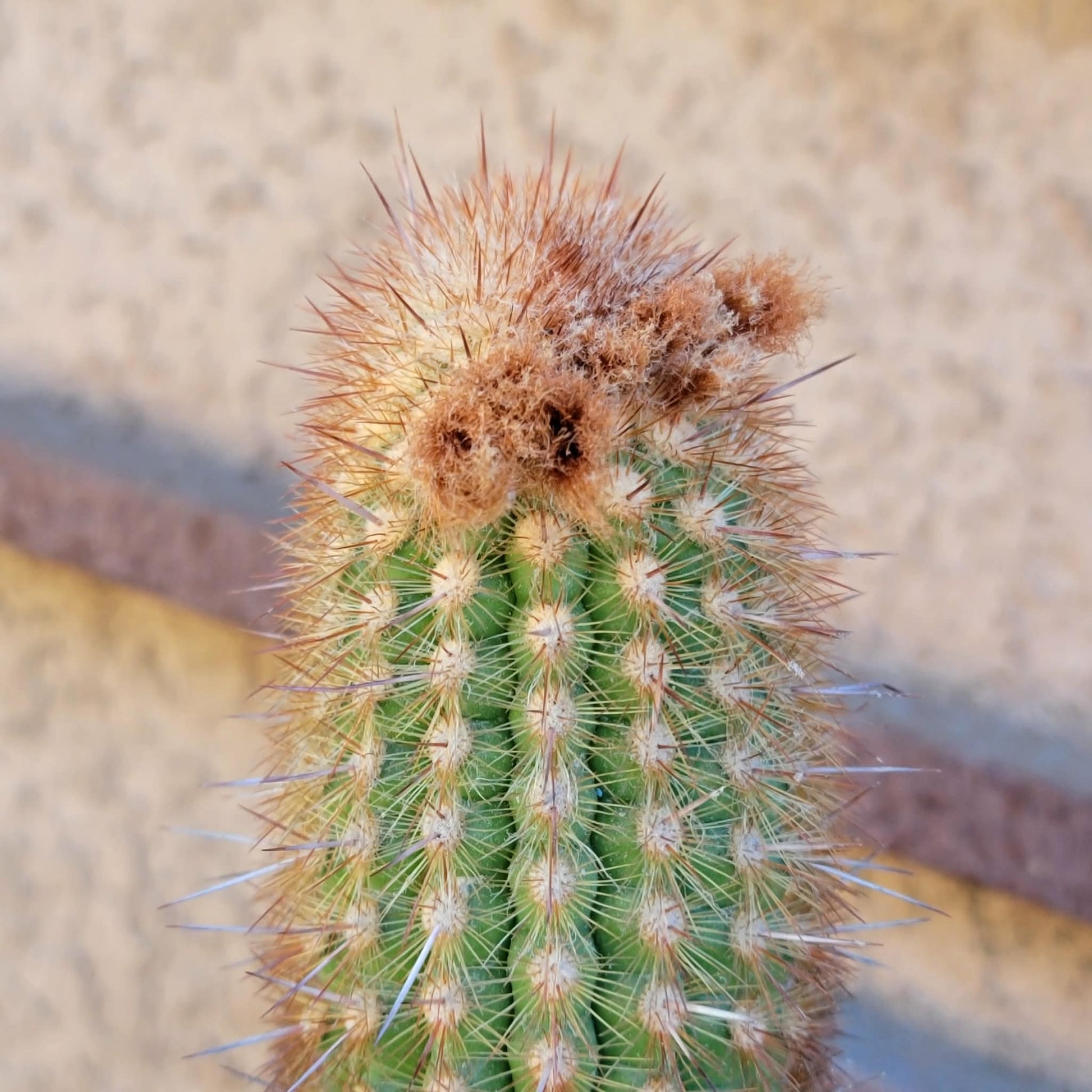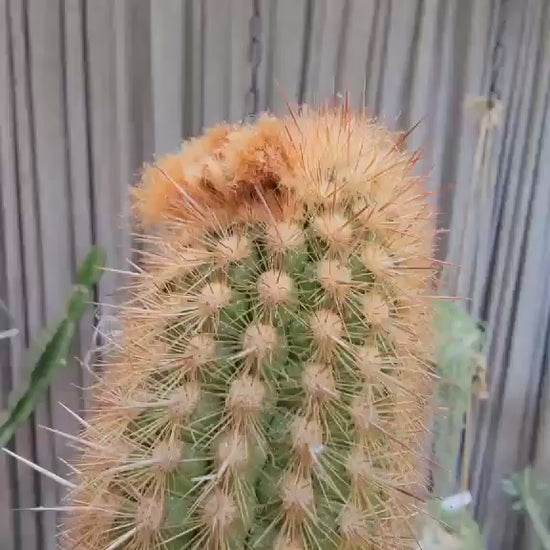 - Cephalium A key feature of mature plants is the development of a cephalium, a specialized, woolly area on the side of the stem where flowers emerge. This structure features vibrant, fox-red, woolly hairs that contrast beautifully with the white-spined stem.