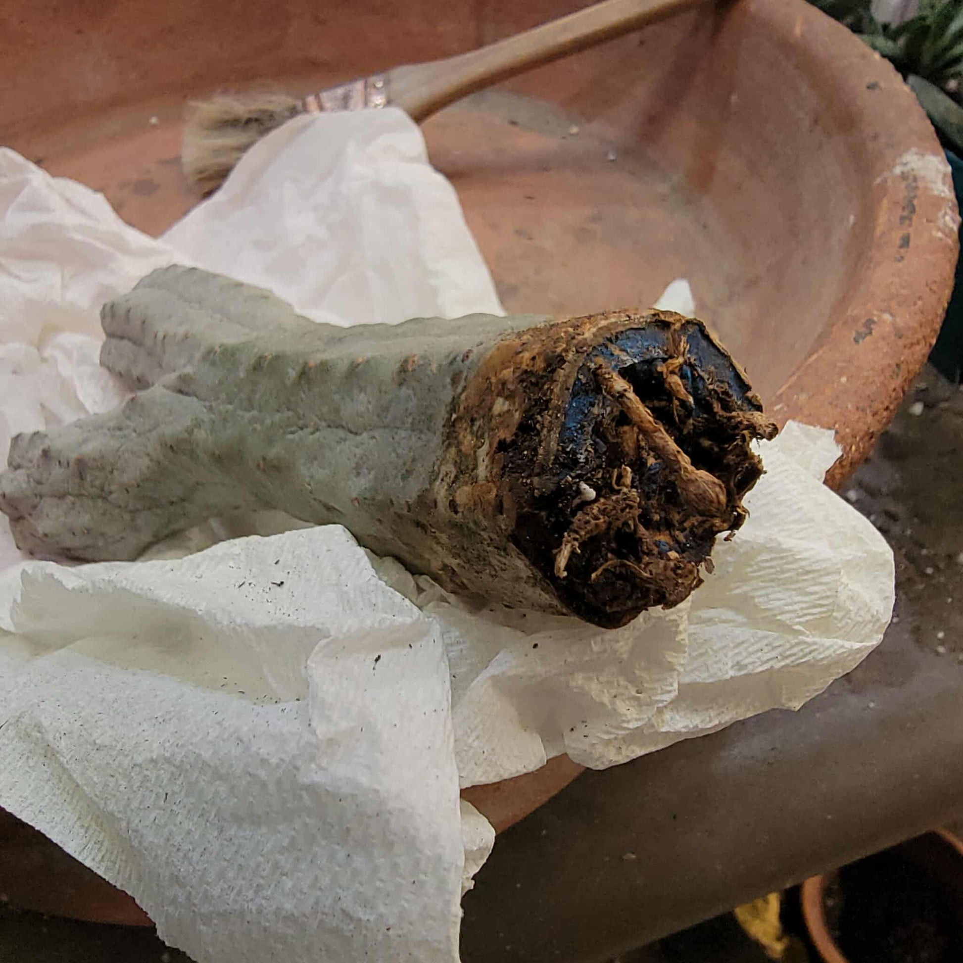 Often compared to a grey, wax-like candle due to its smooth texture and lack of leaves or spines. |