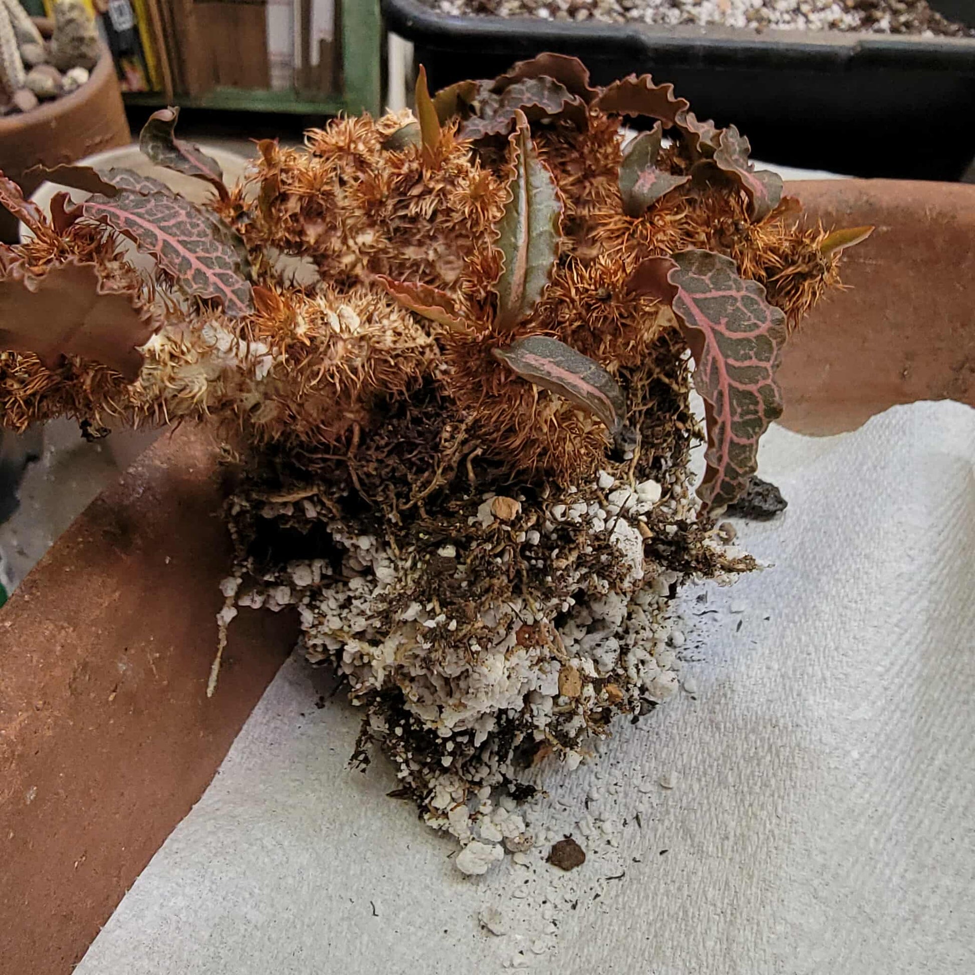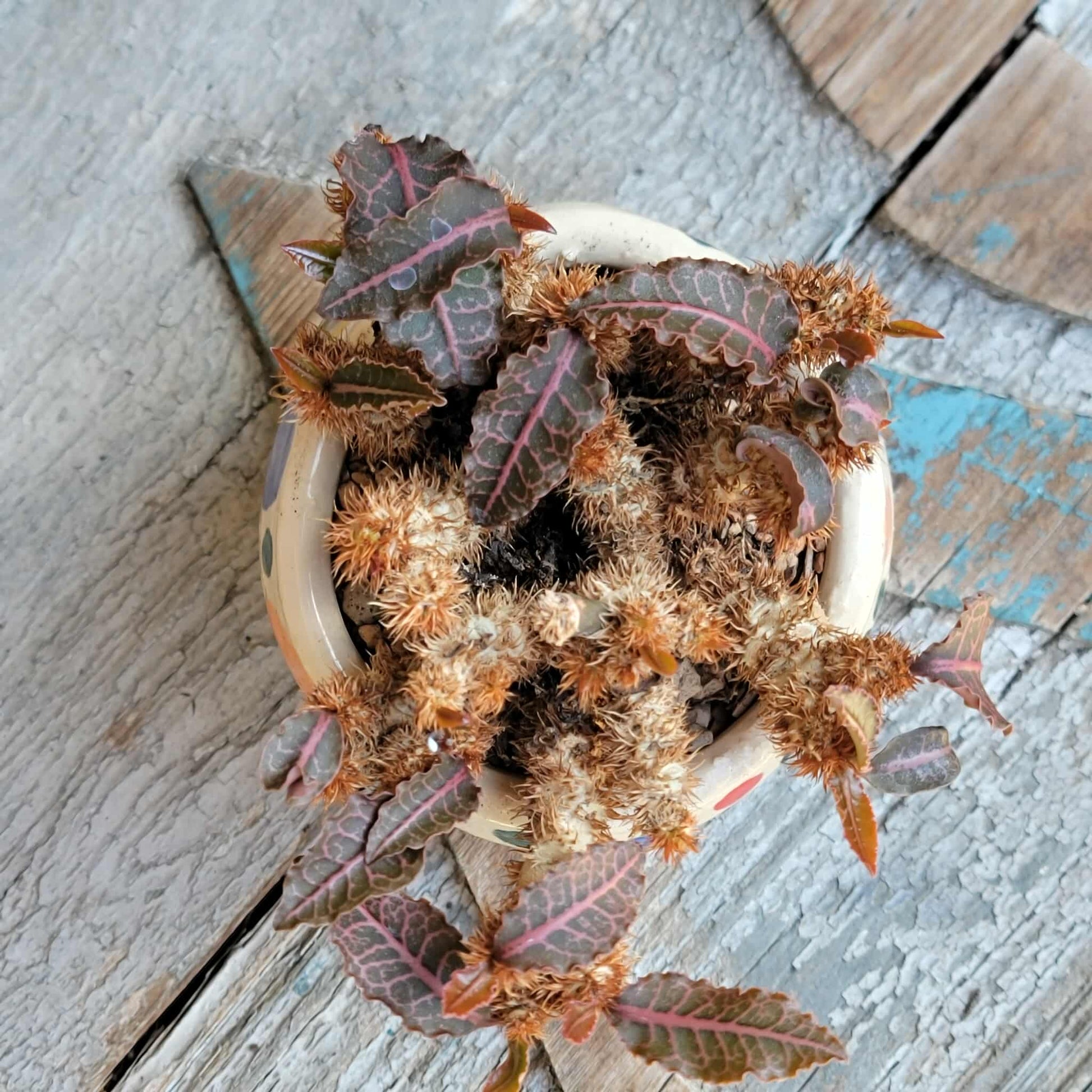- Appearance: It is a small, caudex-forming shrublet, reaching about 15 cm in height. Its leaves are particularly notable for their stunning array of shapes and colors, which can change with the seasons. The leaves can be oblong, lanceolate, spade-shaped, or even deltoid or lyre-shaped. They are typically smooth, leathery, and multicoloured, including shades of dark green, pink, purple, white, and variegated patterns.