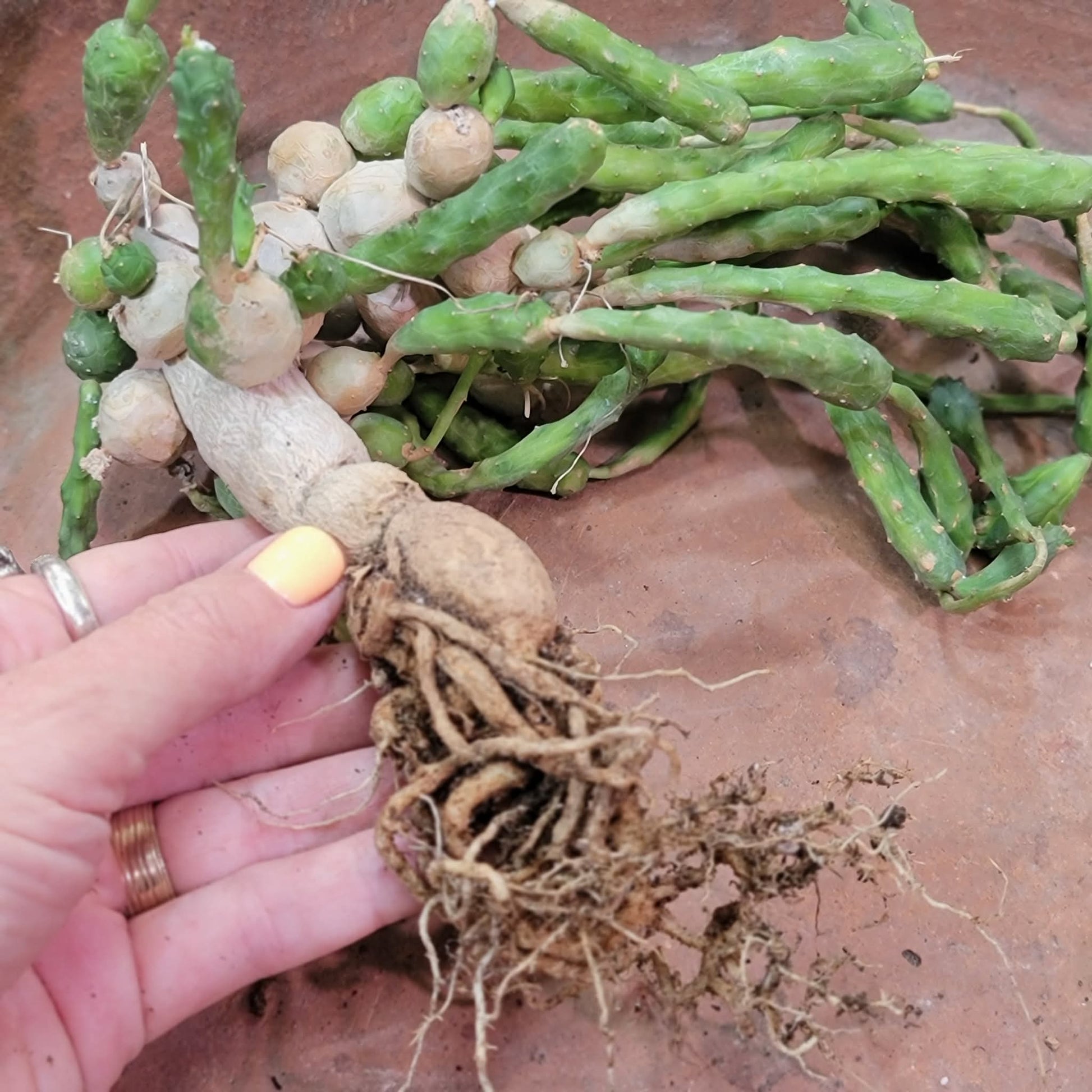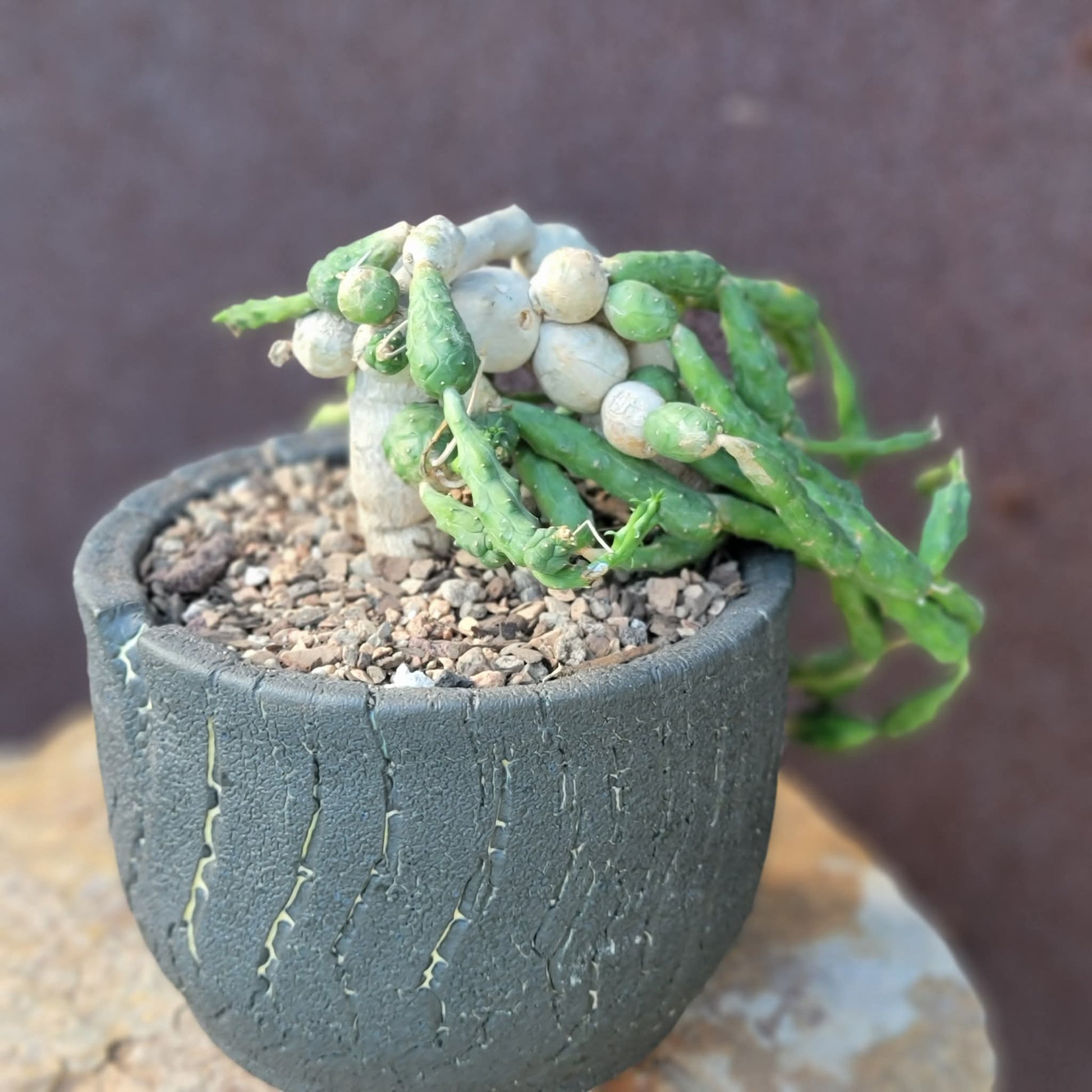 - Appearance: This succulent features distinct globular, segmented stems that can grow up to 8 cm tall and form dense mats up to 30 cm in diameter. As the plant matures, the older segments can callous over and create a base resembling a woody root (caudiciform base).