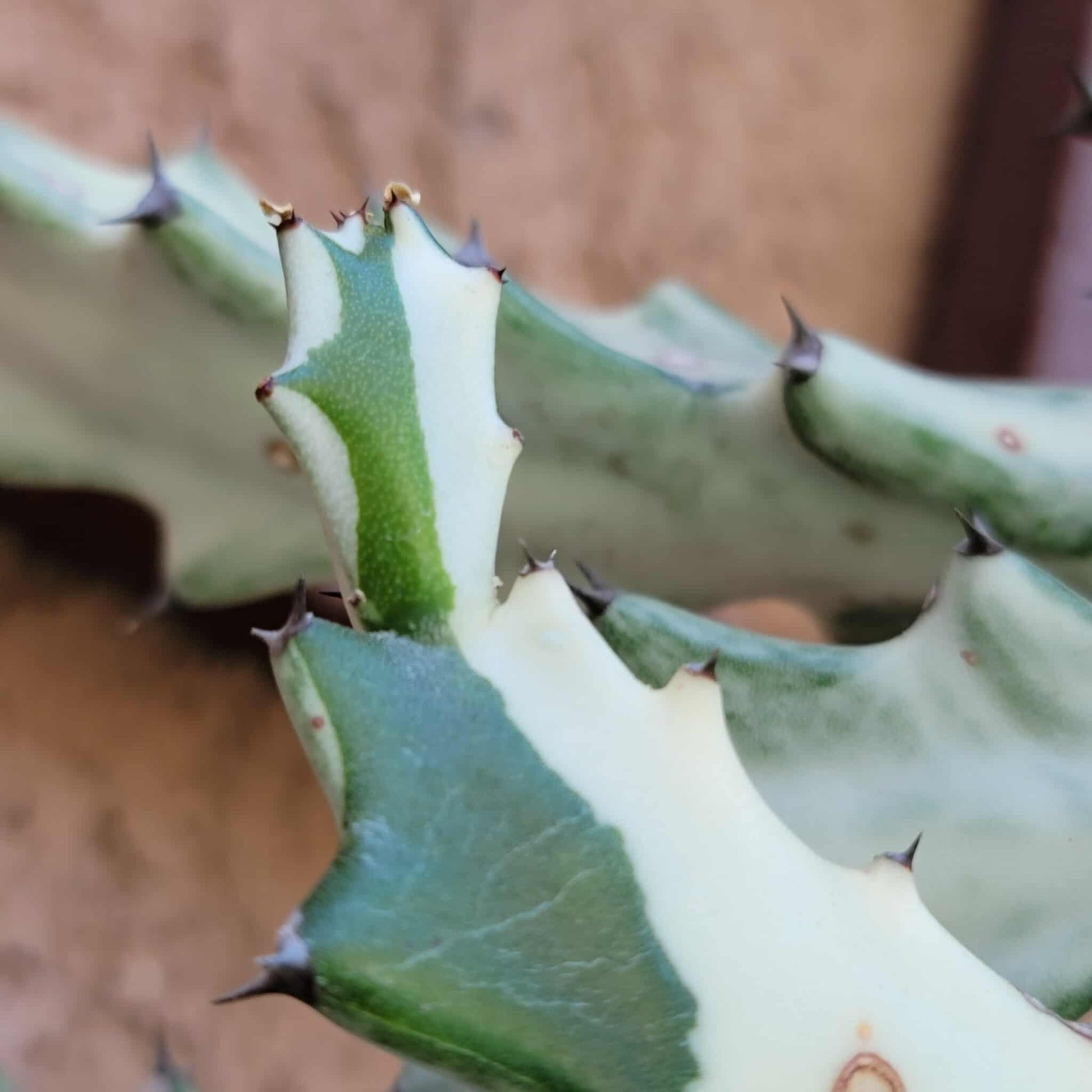The 'White Ghost' is an upright, branching succulent with thick, fleshy, triangular stems that grow in a candelabra form. The stems are variegated with shades of white, cream, and sometimes tinges of pink or green. It has spiky thorns along the edges of its stems and produces small, yellow-white or greenish-yellow flowers in the spring, which are generally inconspicuous. In its natural habitat (tropical Asia and Africa), it can grow up to 6 feet tall, but typically remains smaller (around 1-3 feet) when grown as a houseplant.
