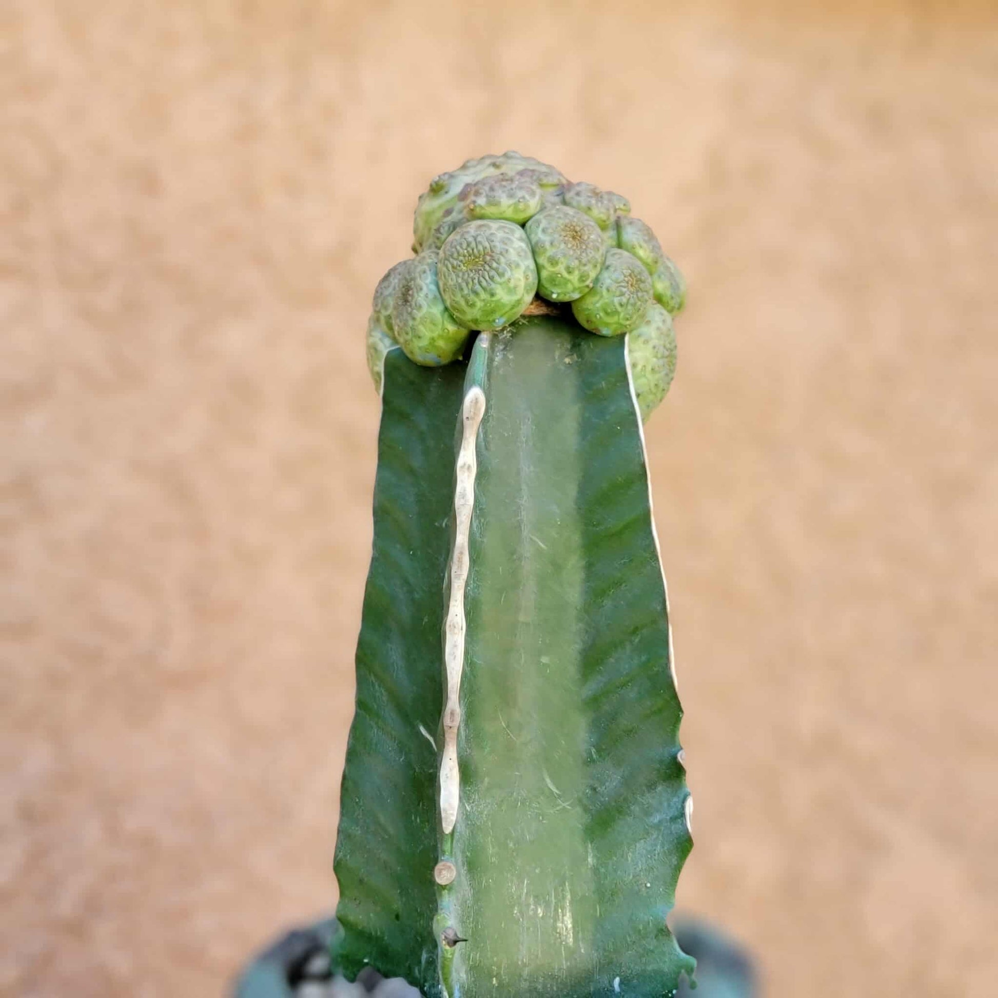 - Flowers: Produces small, yellow cyathia (both male and female) on short peduncles at the apex of the plant body.