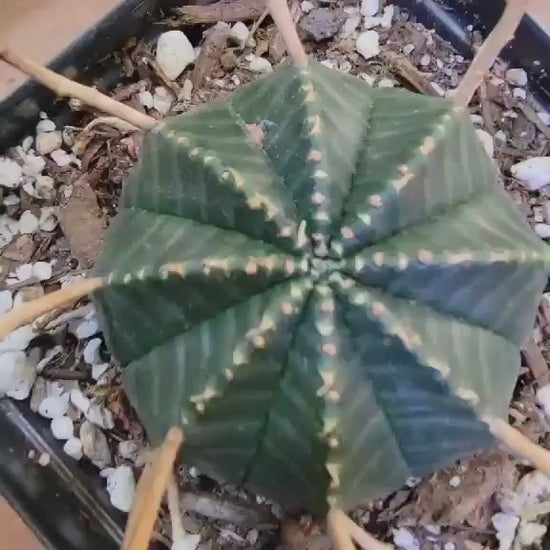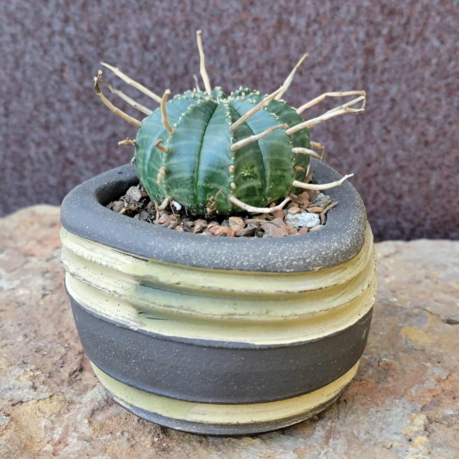 · Appearance: This slow-growing, dwarf succulent has a ribbed, globular body that is dark green with paler, horizontal bands. The stem has 8 to 12 ribs and can reach up to 20 cm in diameter.