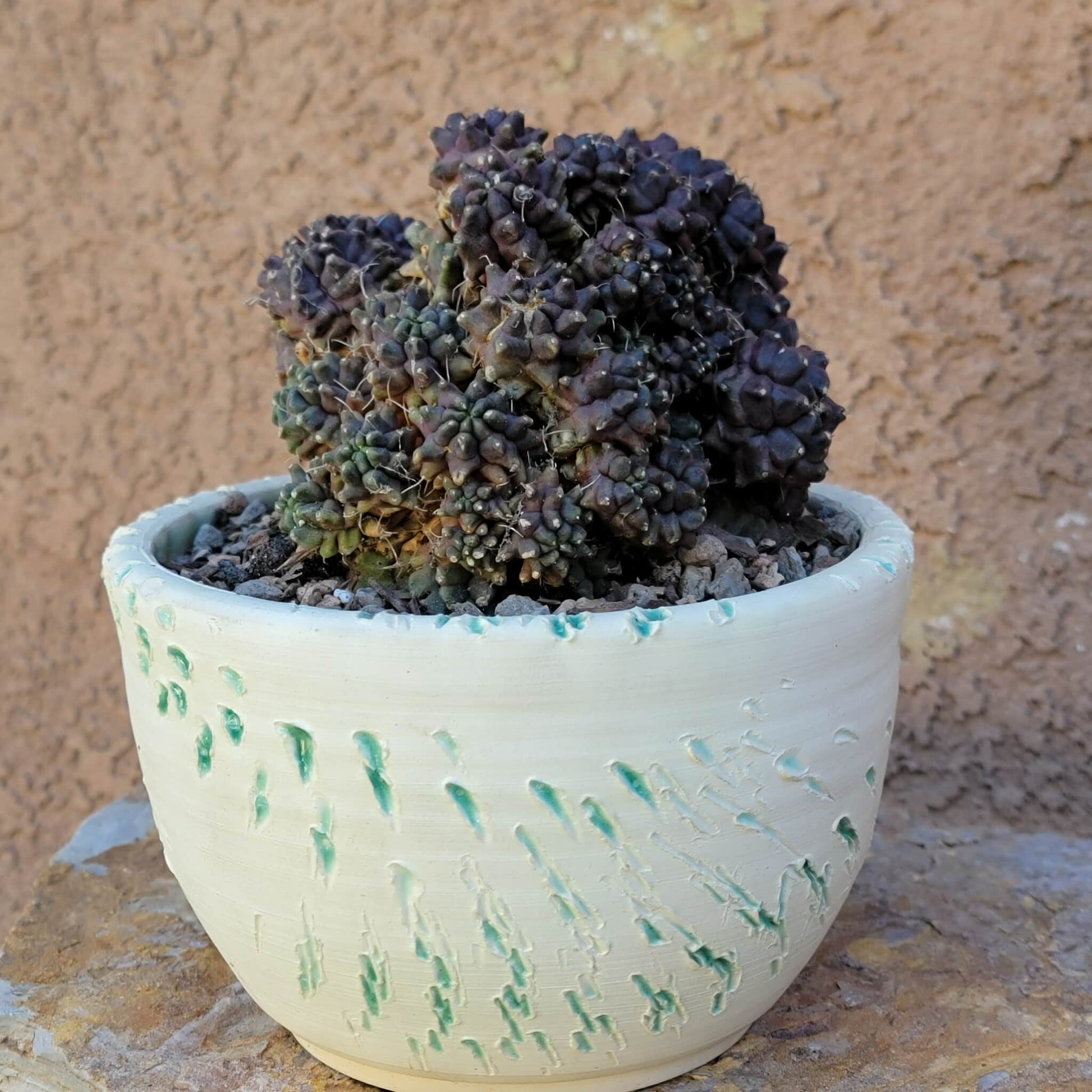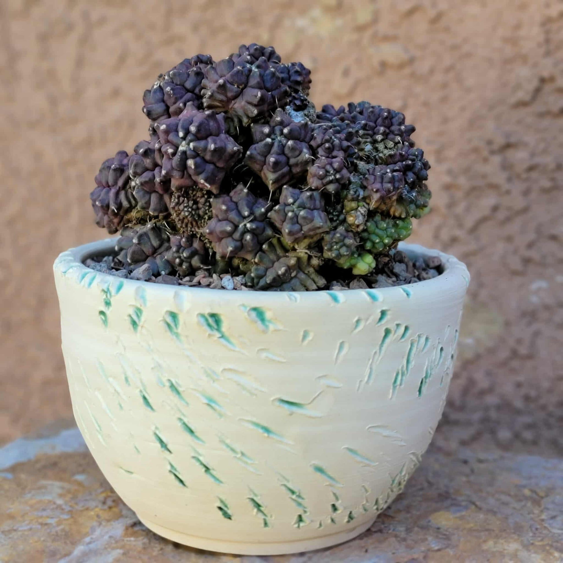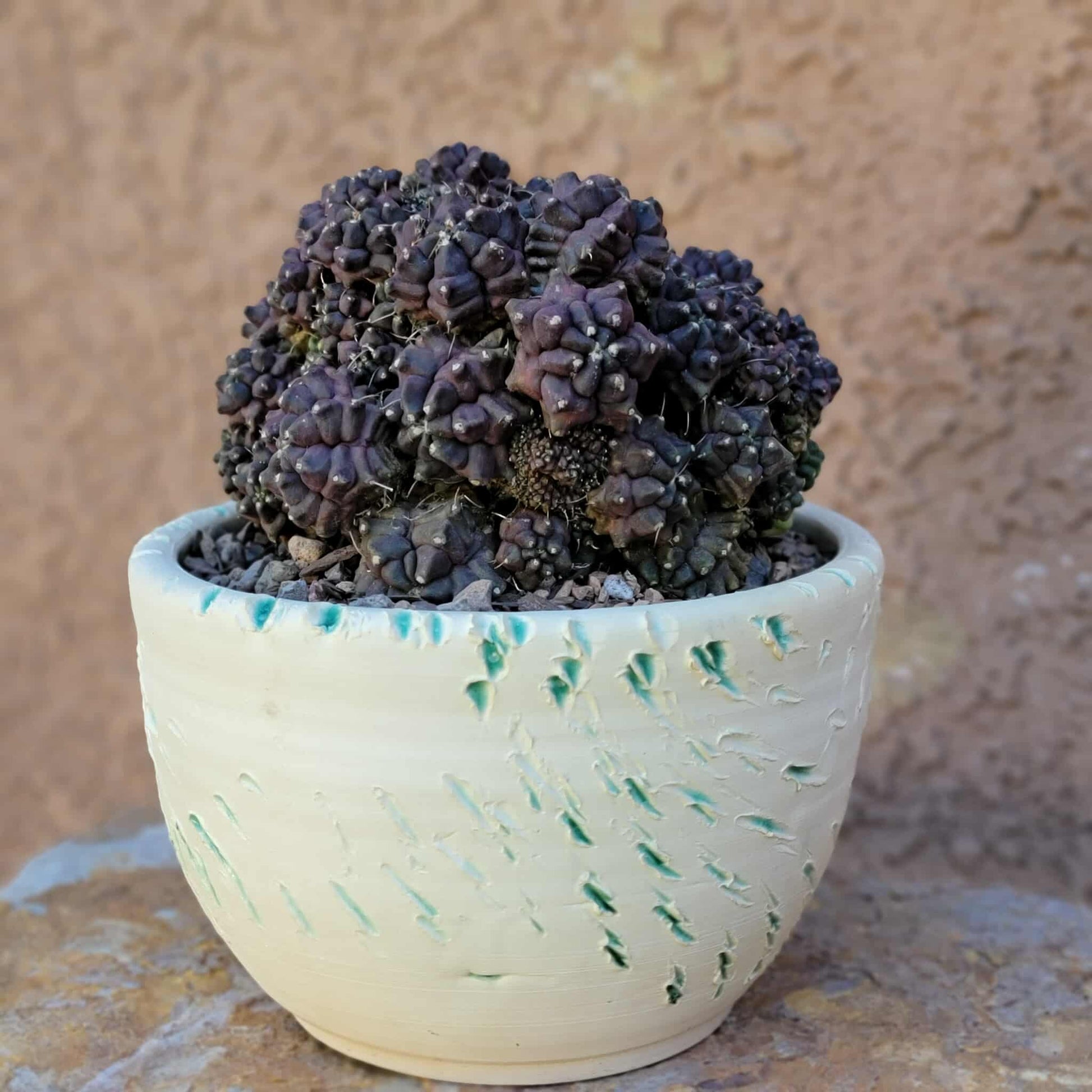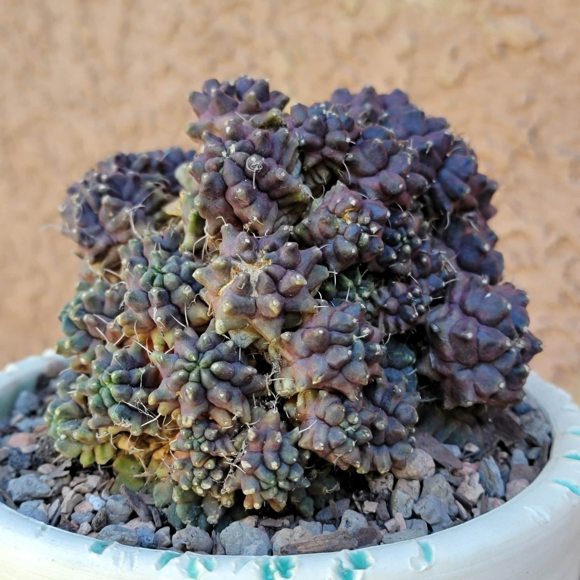 - Appearance: This cactus has a distinctive "monstrose" growth with a bumpy or knobby surface and irregular ribs. It often has prominent tubercles along the rib edges, creating a somewhat saw-toothed look. Its appearance has been likened to a tortoise shell, which is reflected in its name "Kikko," the Japanese word for "Turtle shell". The stem is typically a deep olive-green to yellowish-green, which can turn purplish or brownish in full sun.