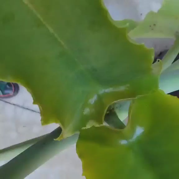 - Leaves: Large, undulating, slightly triangular, light olive-green leaves with a smooth, hairless (glabrous) surface.