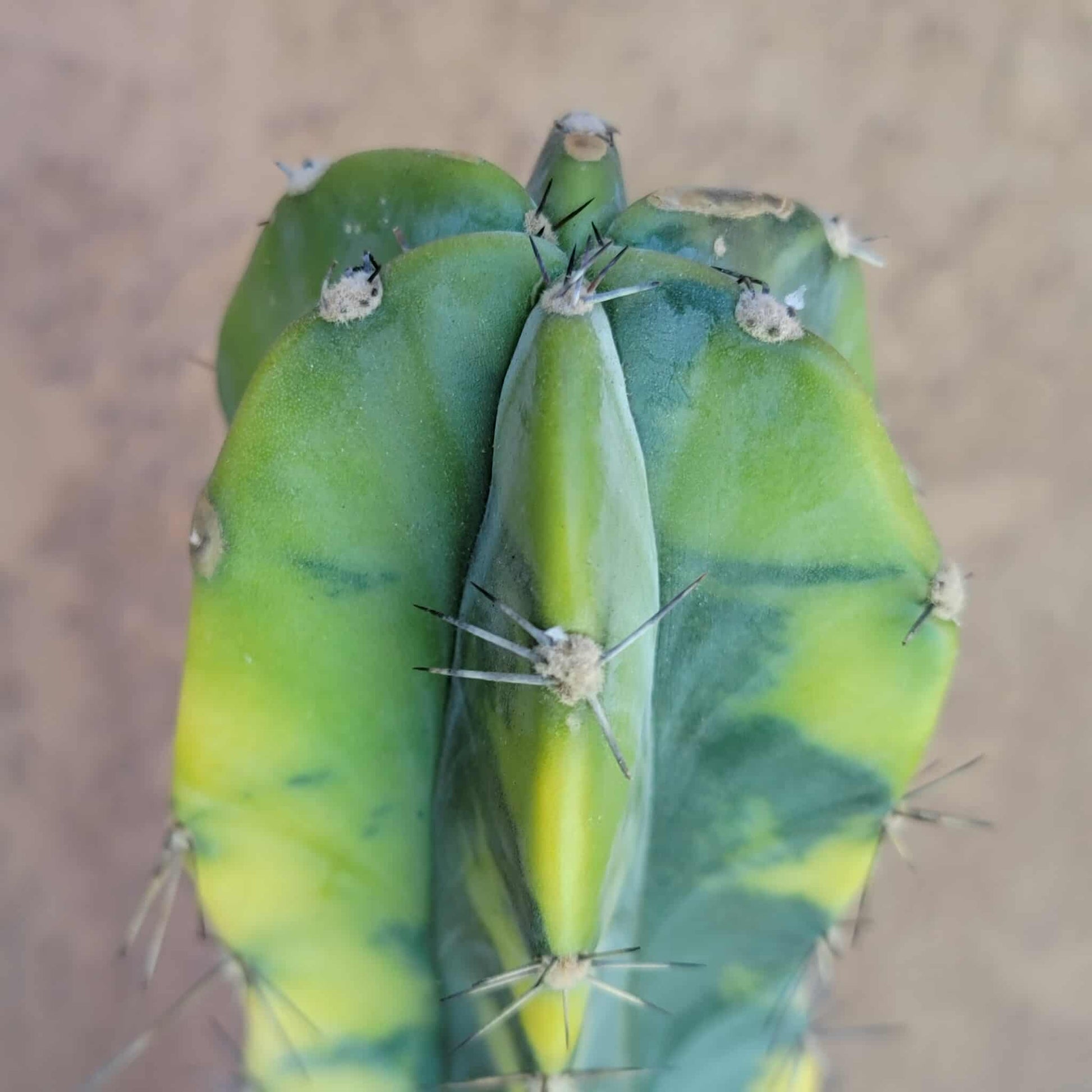 - Spines: Each areole (the small bumps along the ribs) has a few short, straight, brownish-gray spines.