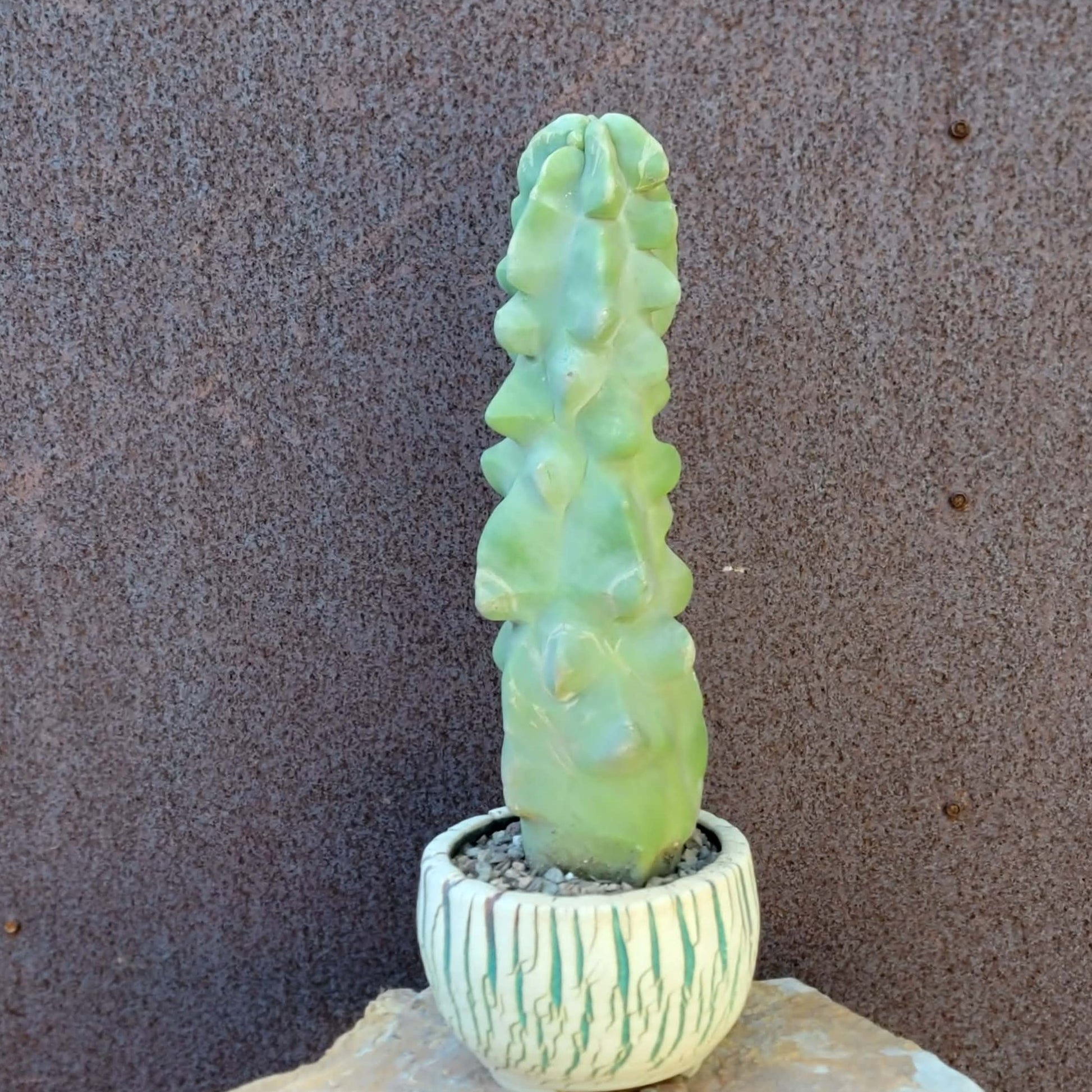 - Appearance: This cultivar is characterized by its bumpy, knobby, and spineless columnar stems. Instead of typical branching, it often grows in a single elongated column. It can have a light gray to bluish-green color. Some forms have irregularly shaped ribs with tubercle-like swellings.