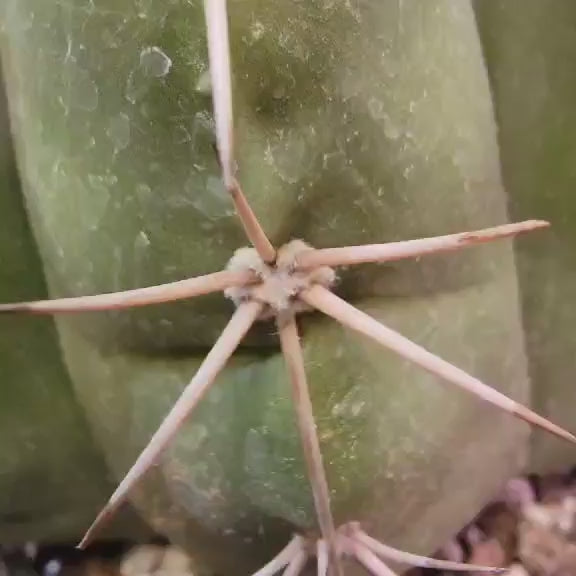 - Appearance: Young plants are globular, but the body can elongate slightly with age. The green body is marked with prominent ribs lined with areoles, from which small spines grow.