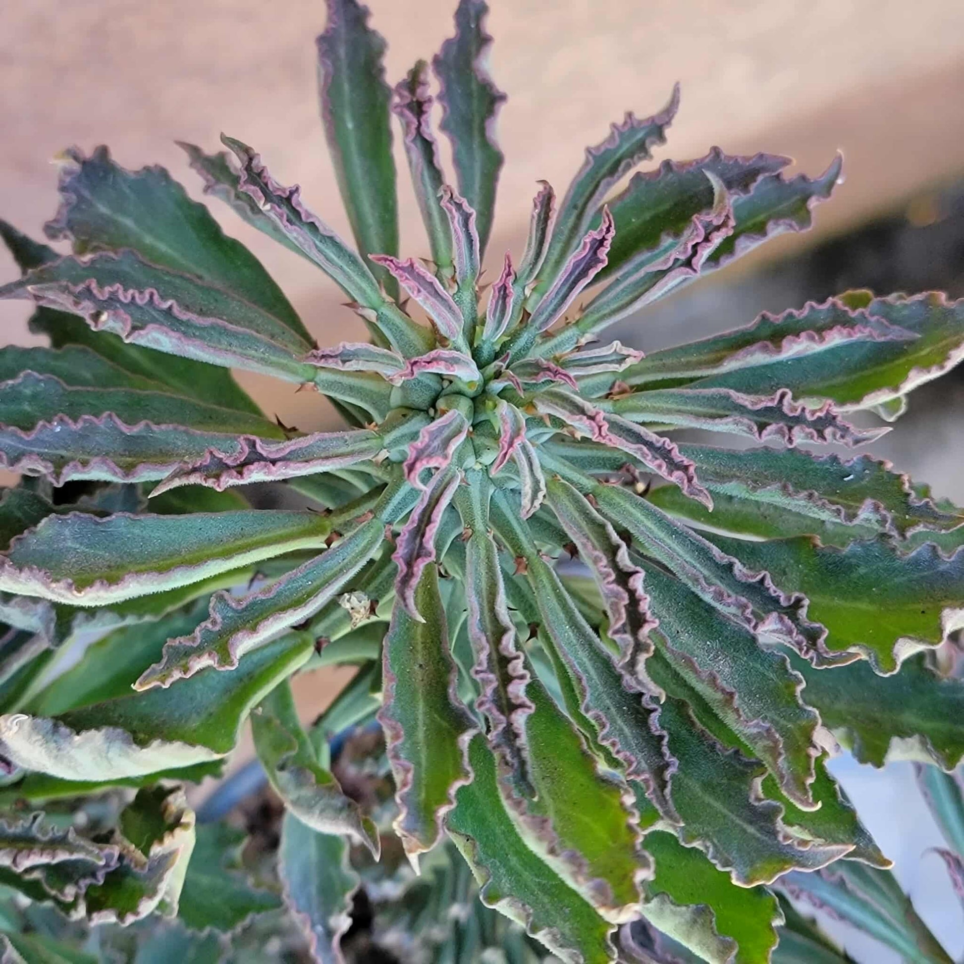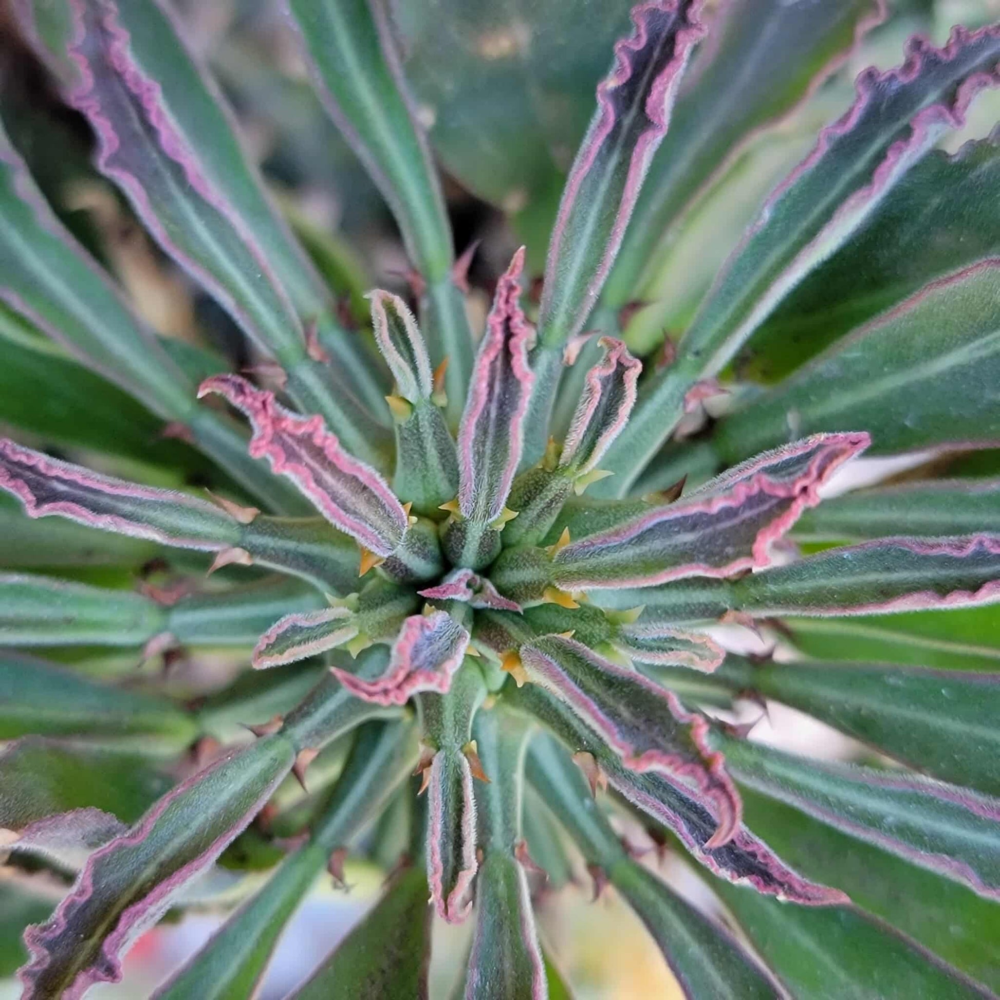 - Flowers (Cyathia): Small, inconspicuous, pink-rimmed flowers enclosed by pinkish-grey bracts. It typically flowers in late summer to early fall.