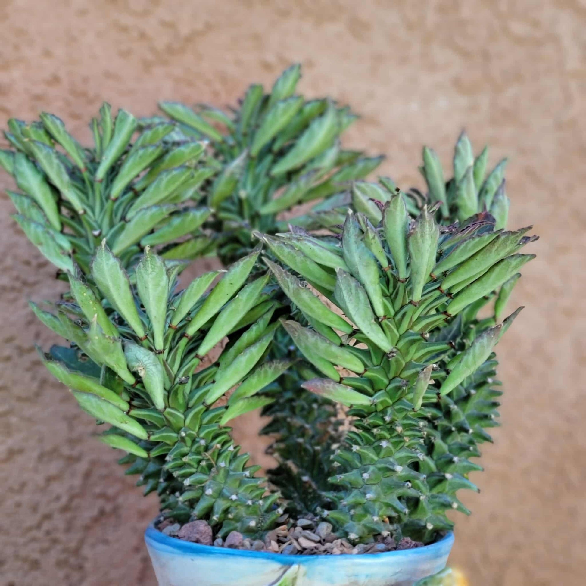 - Appearance: This perennial succulent has stout, fleshy stems with prominent tubercles. Stems can be bluish-green and may develop purple or red streaks in full sun.