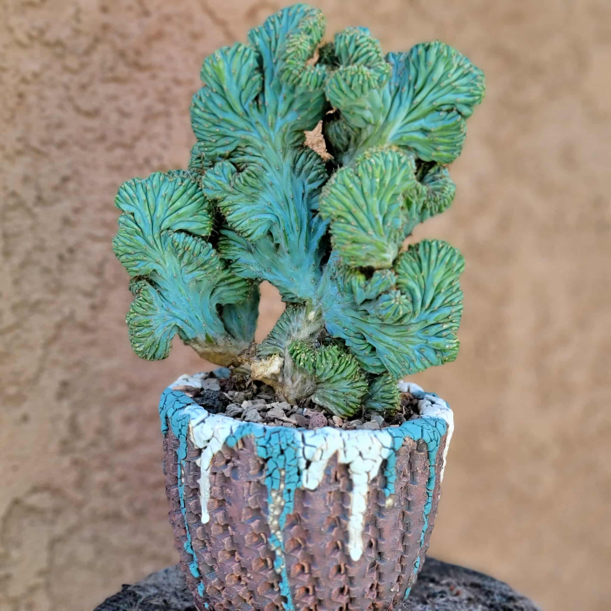- Appearance: Features a distinct crested form with wavy, undulating ridges along its stems, giving it a sculptural look. It typically displays a blue-green color.