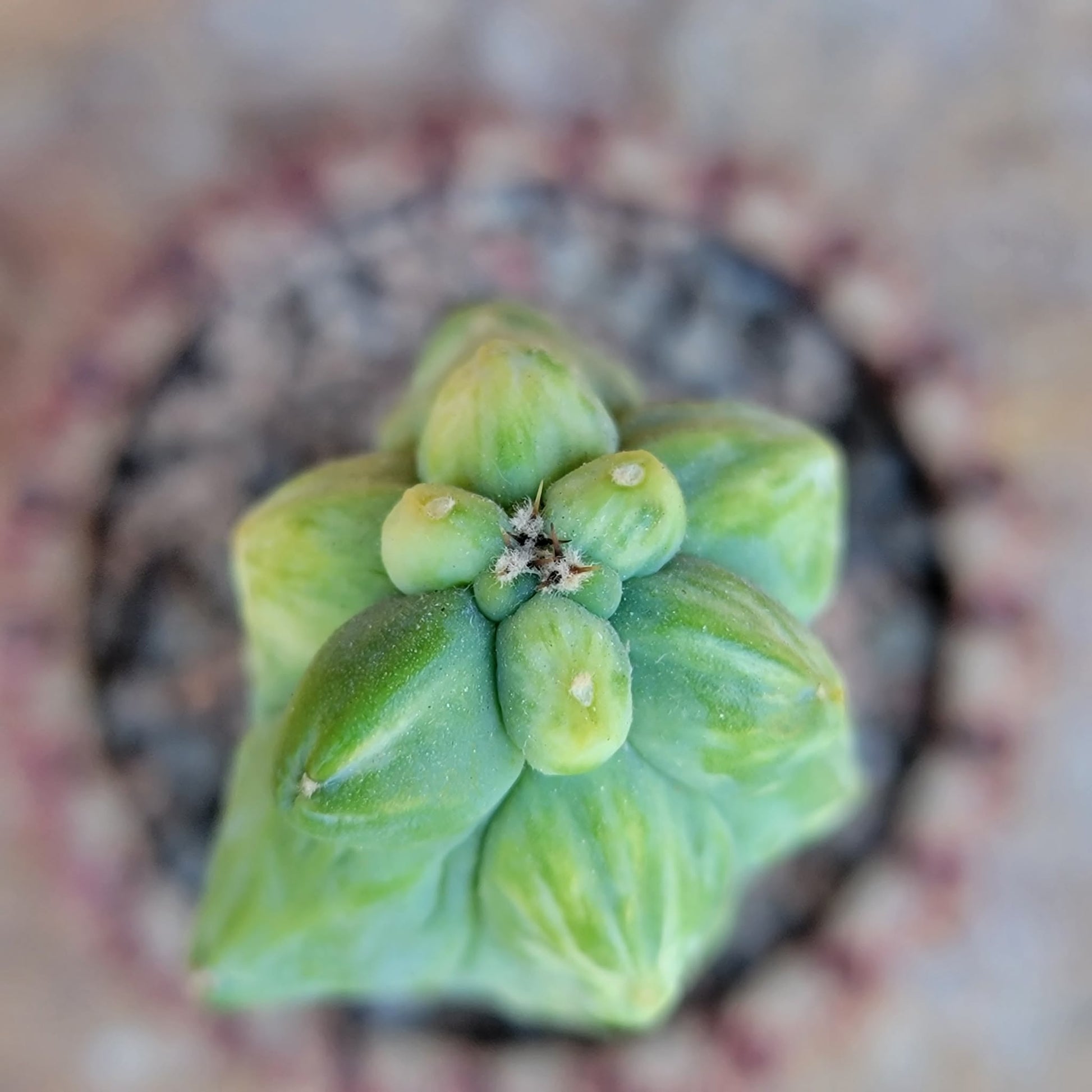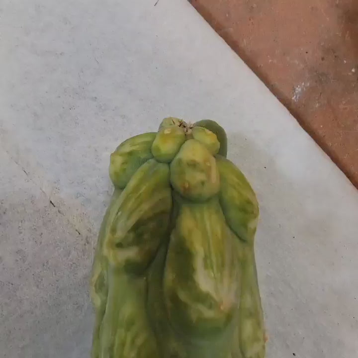 This uniquely shaped cactus is a Japanese cultivar of the Mexican Myrtillocactus geometrizans, also known as the Blue Candle Cactus. It's nicknamed the "Boobie Cactus" or "Breast Cactus" because of its distinctive tubercles (bumps) and ribs that resemble the female anatomy. This unusual form makes it highly sought after by cactus collectors and enthusiasts.