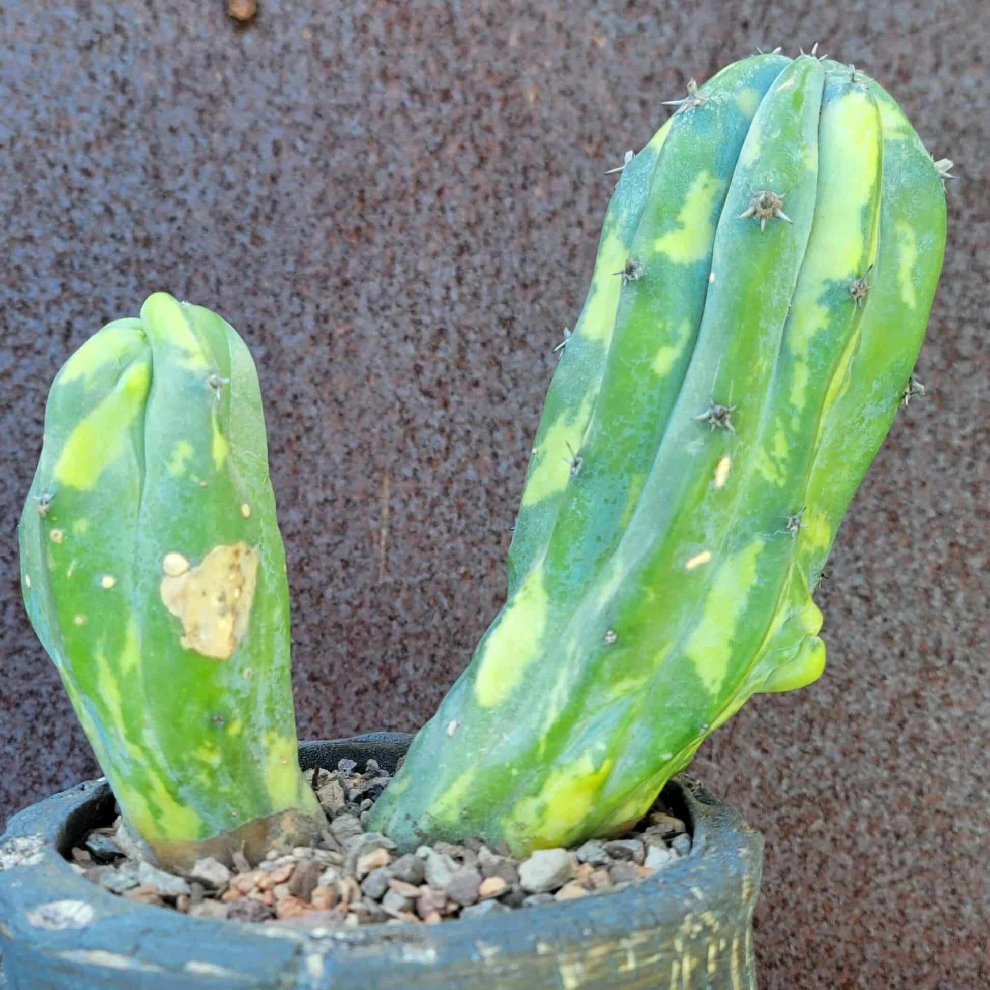 Myrtillocactus geometrizans variegata monstrose is a captivating cactus variety, combining the unique traits of variegation, monstrose growth, and the species Myrtillocactus geometrizans. It's known for its striking appearance, often with creamy white or yellow patches on its blue-green stems, and its irregular, contorted growth pattern.