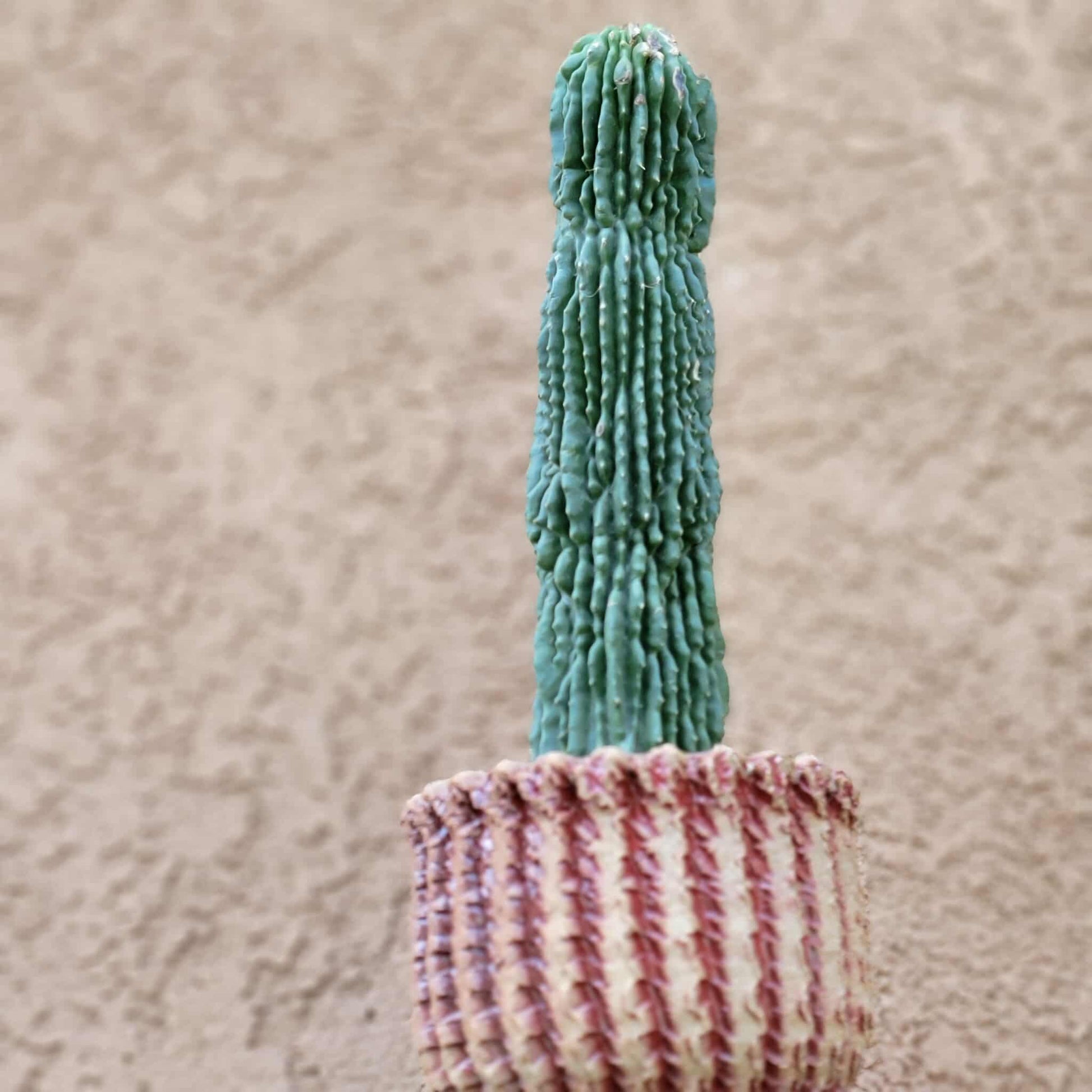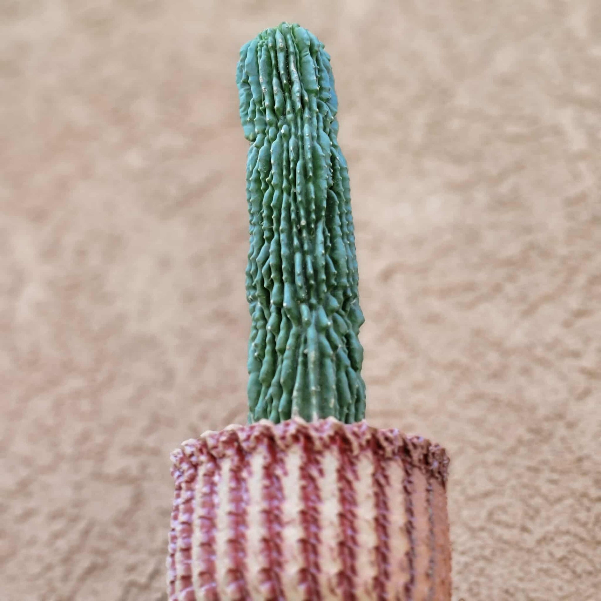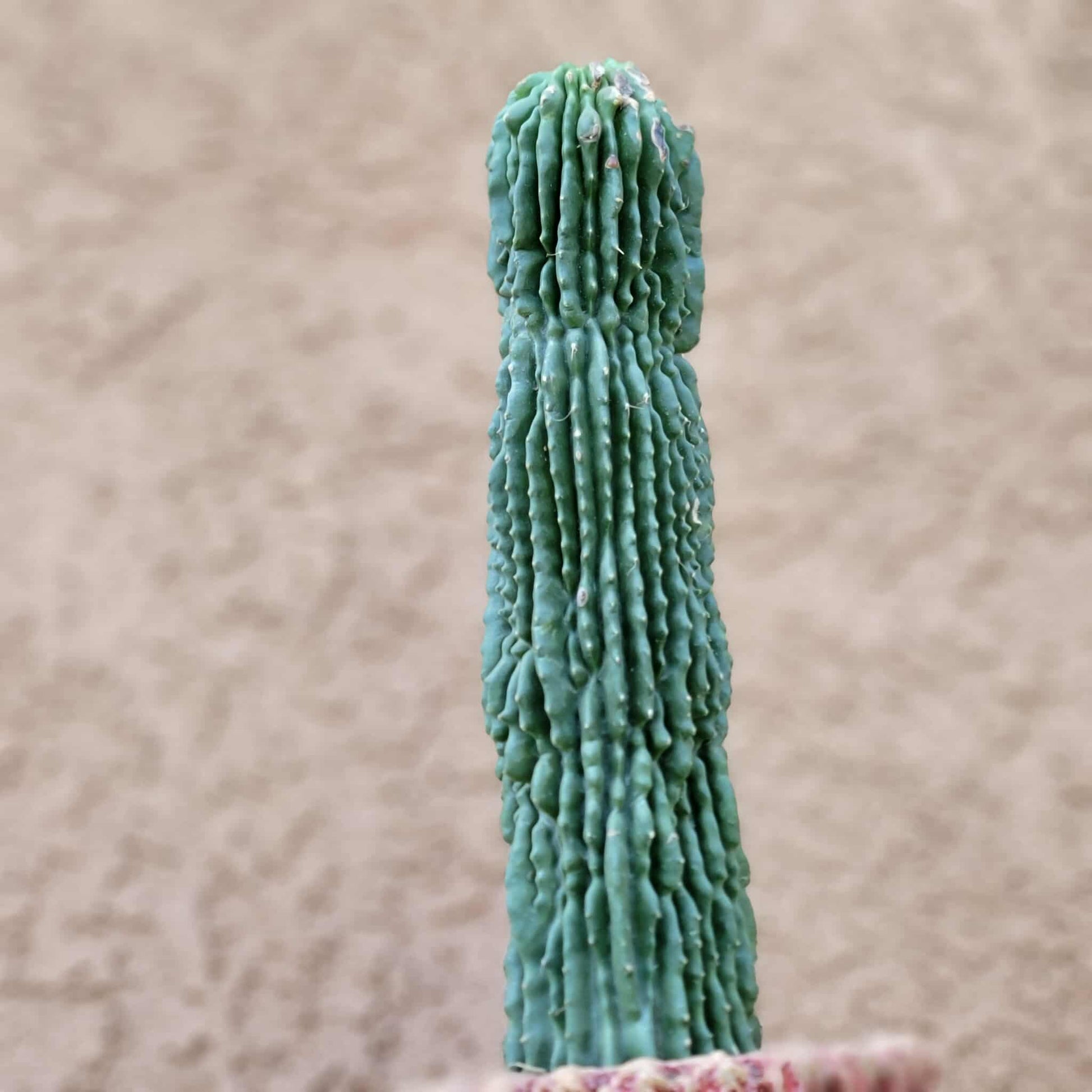 Neobuxbaumia polylopha inermis, also known as the golden saguaro, is a columnar cactus native to Mexico, characterized by its golden-yellow spines and tall, upright growth habit.