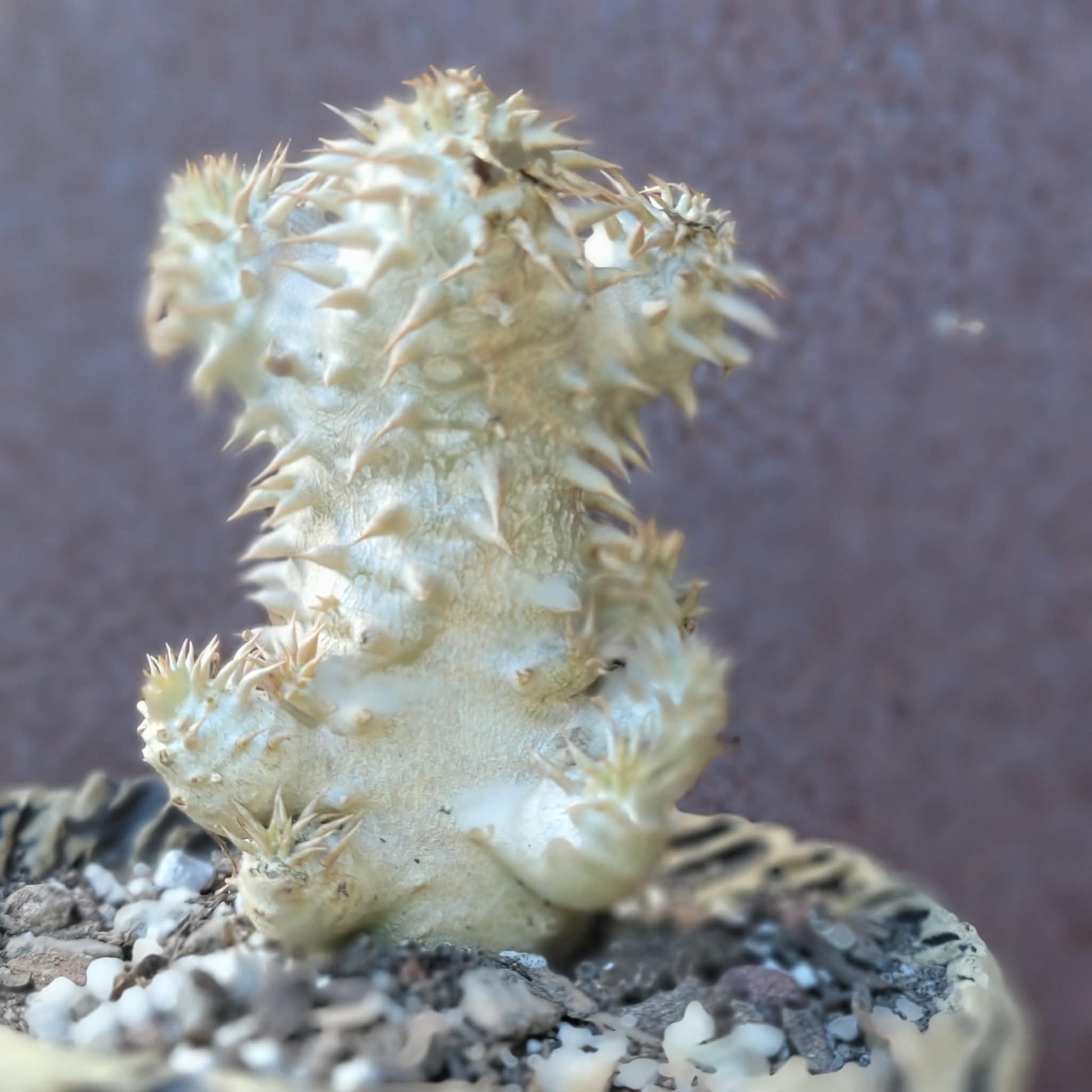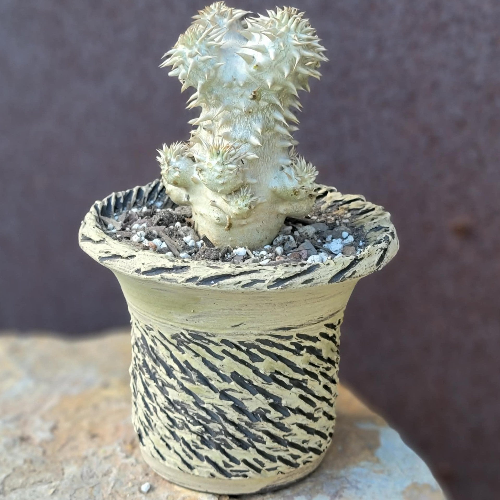 - Potting: Repot every 2-3 years in a shallow, wide pot. The plant has sharp spines, so use caution and wrap the trunk in newspaper when handling.