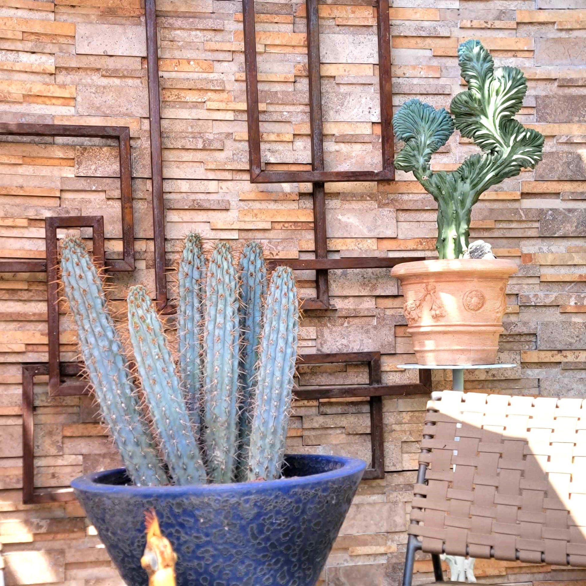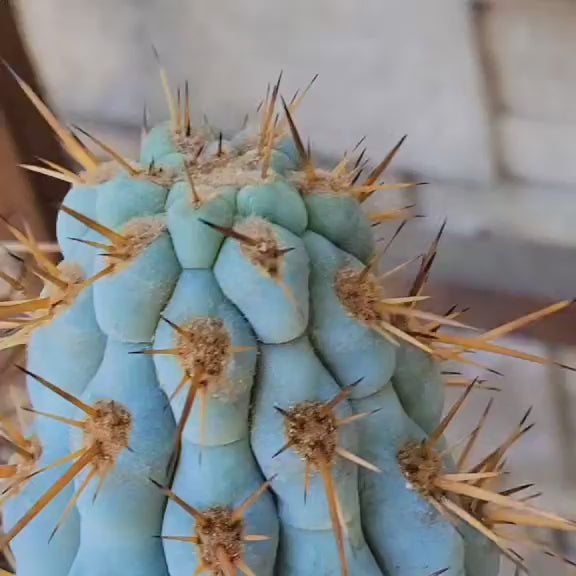 - Stems: Erect, up to 30 cm in diameter, exhibiting a fantastic vivid turquoise blue color when young, transitioning to a pale olive green with age. Requires warm climate and ample light to develop the characteristic blue color.